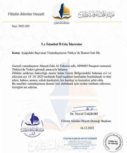 Filistin Refah doğumlu olan Ahmed Altahrawi, Siyonist İsrail’in saldırılarında annesi, babası ve kardeşleri şehit oldu. Kendisi de yaralanan Ahmed, vücudunda şarapnel parçaları taşıdığından tedavi amaçlı Türkiye’ye getirildi. Filistin Alimler Heyeti’nin Ahmed’e referans ve kefil olunduğunu beyan eden bir mektup da bulunuyor.