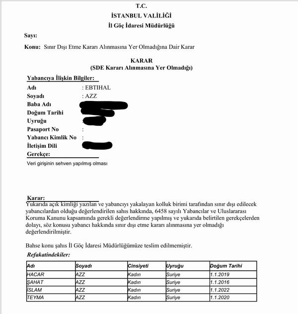 Hiçbir soruşturması olmayan Ebtıhal Azz Hanımefendi ve 4 çocuk hakkında “Sınır Dışı Edilmelerine Gerek Yoktur” kararı verilmesine rağmen, 4 küçük çocuk ile beraber idari gözetim altına alınıp, GGM'ye götürüldüler. Aile aylardır burada tutuluyor.