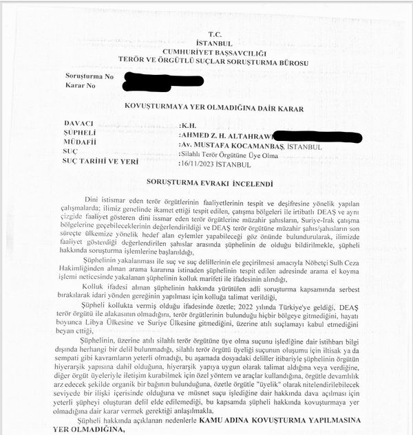 Ancak İstanbul Cumhuriyet Başsavcılığı tarafından Ahmet Altahrawi hakkında terör örgütü üyesi olduğu şüphesi ile soruşturma başlatıldı.