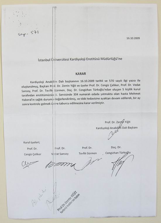 Haberal 19 aydır 'kalp ritmi bozulur' gerekçesiyle Kardiyoloji Enstitüsü'nde yatıyor. Haberal, sağlığı ile ilgili olarak 1 Ağustos 2009'da Adli Tıp Kurumu'nda kontrolden geçirilmişti. Kurum kalp ritim bozukluğu olduğu ifade edilen Haberal'ın 24 saat Kardiyoloji Enstitüsü'nden bağımsız bir hastanede izlenmesini istedi. Ayrıca iddia edilen hastalığının tedavisi için birtakım işlemler yapılmasına karar verdi. Fakat Haberal hem teşhis hem de tedavi için istenilenleri kabul etmedi. Bunu da imzalı bir kağıtla belgeledi. Bu durumdan iki ay sonra ise 16 Kasım 2009'da altında Kardiyoloji Enstitüsü Kardiyoloji Anabilim Dalı Başkanı Prof. Dr. Zerrin Yiğit'in imzasının da bulunduğu beş kişilik kurul, Haberal'ın bundan sonraki tıbbi tedavisinin ayakta devam edebileceğini belirterek taburcu kararı verdi.