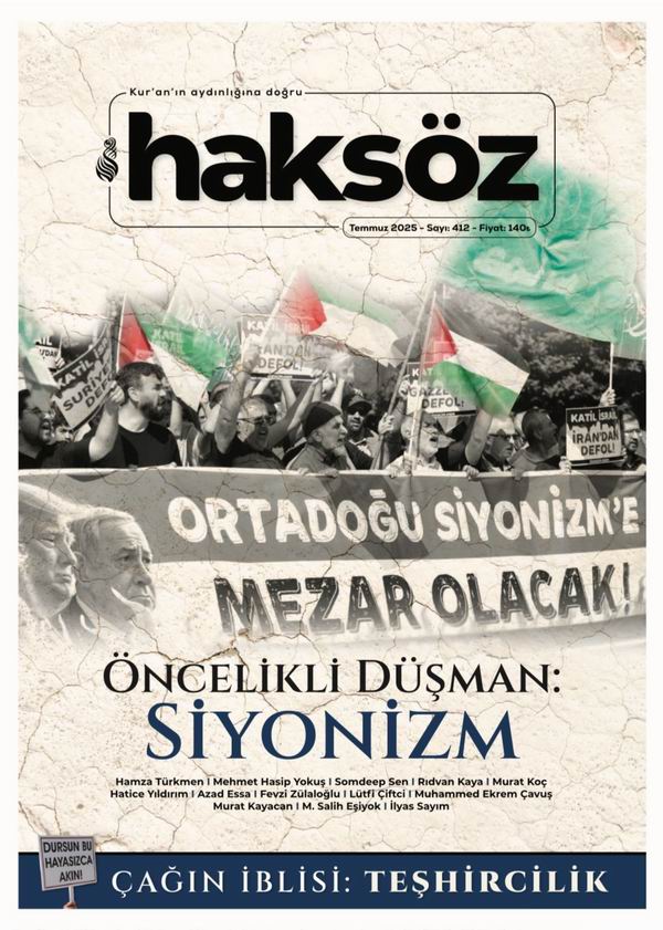 1991’den bu yana “Kur’an’ın aydınlığına doğru” şiarıyla aylık yayınını sürdüren Haksöz’ün Temmuz 2025 tarihli412. sayısı çıktı. Gazze’de soykırımı sürdüren İsrail’in İran’a yönelik saldırısının da kapağa taşındığı dergi, “Öncelikli Hedef Siyonizm” manşetiyle yayınlandı.