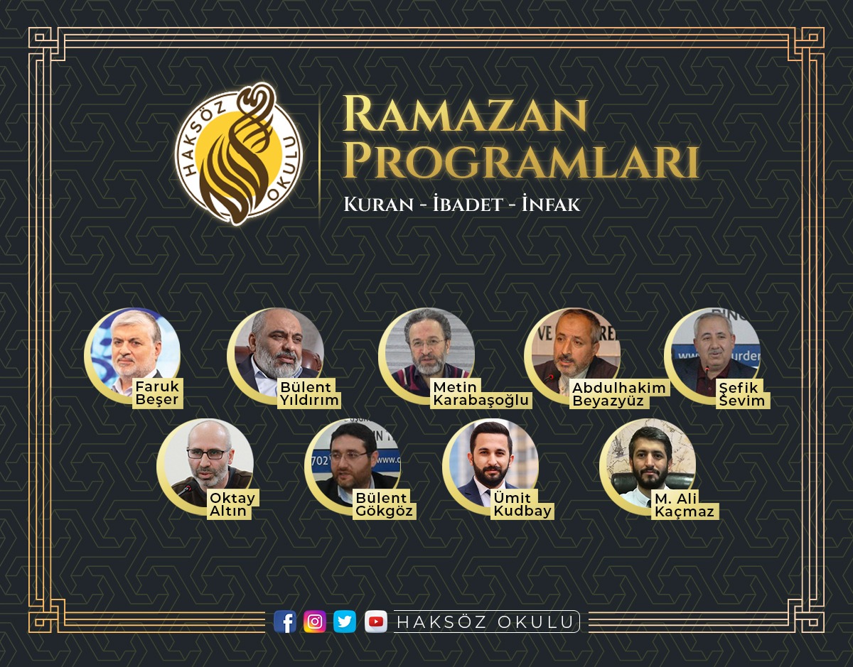 Salgın sürecinde programlarına devam eden Haksöz Okulu ise Ramazan ayı boyunca pazar akşamları evlerinize konuk olacak inşallah. Kuran’la bütünleşmenin sağlanması amaçlanan, ibadetlerle insanın kendisini muhasebe edebildiği ve ümmet olma bilincinin infakla güçlendirildiği Ramazan ayını en iyi şekilde idrak edebilmeyi amaçlayan programlarda, Faruk Beşer, Bülent Yıldırım, Metin Karabaşoğlu, Abdulhakim Beyazyüz, Şefik Sevim, Oktay Altın ve Bülent Gökgöz; Ümit Kudbay ve M. Ali Kaçmaz’ın moderatörlüğünde misafir edilecek.