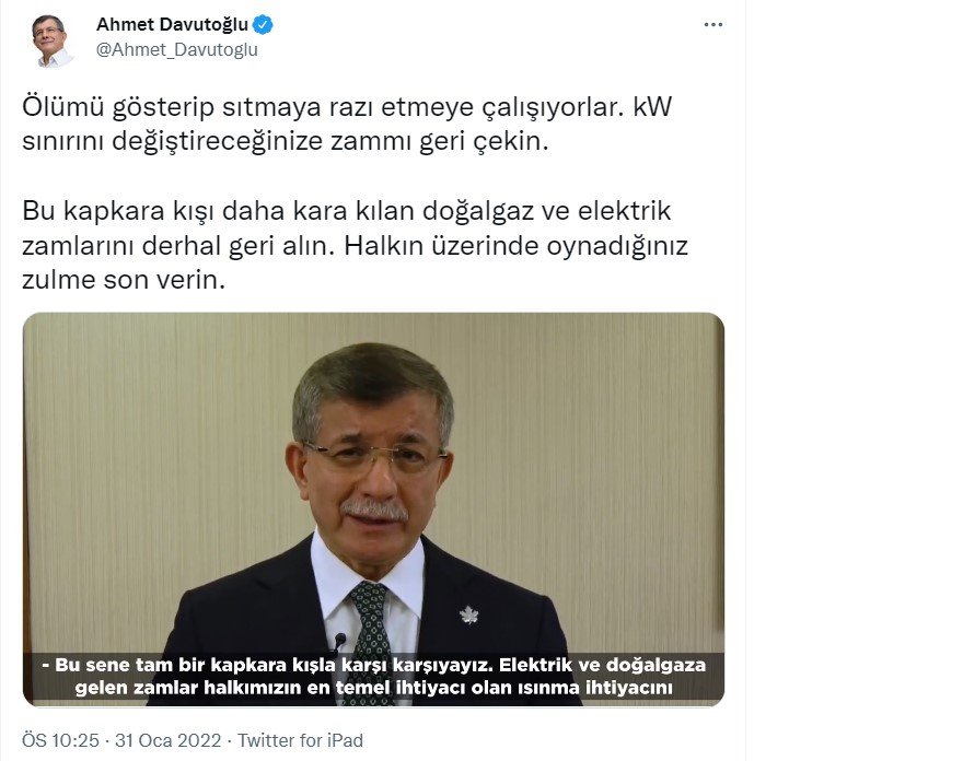 Davutoğlu, “Ölümü gösterip sıtmaya razı etmeye çalışıyorlar. kW sınırını değiştireceğinize zammı geri çekin. Bu kapkara kışı daha kara kılan doğalgaz ve elektrik zamlarını derhal geri alın. Halkın üzerinde oynadığınız zulme son verin.” dedi.