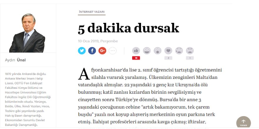 Aydın Ünal’ın Yeni Şafak’ta yayımlanan konuyla alakalı yazısı (10 Ocak 2018) şöyle: