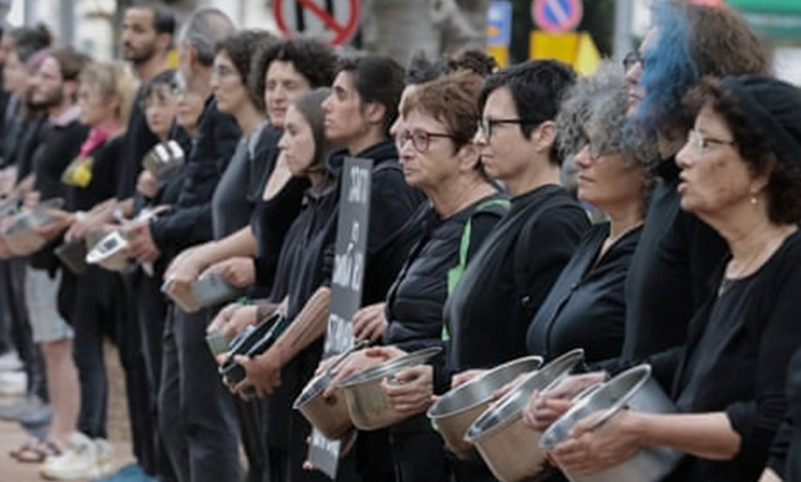 Yaklaşık 40 mil (64 km) ötede, Tel Aviv'in merkezindeki bir meydanda, aralarında Holokost'tan kurtulanların torunlarının da bulunduğu binlerce kişi, savaş başladığından beri öldürülen Filistinli çocukların fotoğraflarını tutuyordu. Düzinelercesi de siyah giysiler içinde Gazze'deki açlığı sembolize etmek üzere ellerinde boş tencerelerle şehrin yollarına dizildi.