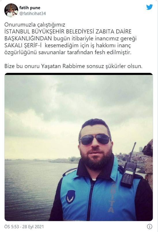 Fatih Püne paylaşımında şunları yazdı "Onurumuzla çalıştığımız İSTANBUL BÜYÜKŞEHİR BELEDİYESİ ZABITA DAİRE BAŞKANLIĞINDAN bugün itibariyle inancımız gereği SAKALI ŞERİF-İ kesemediğim için iş hakkımı inanç özgürlüğünü savunanlar tarafından fesh edilmiştir. Bize bu onuru Yaşatan Rabbime sonsuz şükürler olsun.