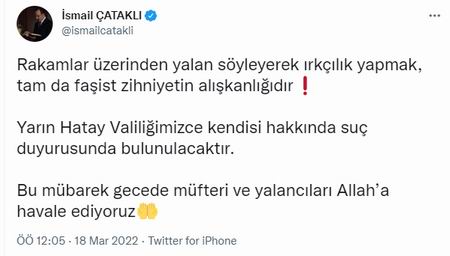 Suriyeli mülteciler aleyhinde yalan bilgiler veren, halkı kin ve düşmanlığa sevk eden Savaş’a tepki gösteren Çataklı, “Rakamlar üzerinde yalan söyleyerek ırkçılık yapmak, tam da faşist zihniyetin alışkanlığıdır.” dedi.