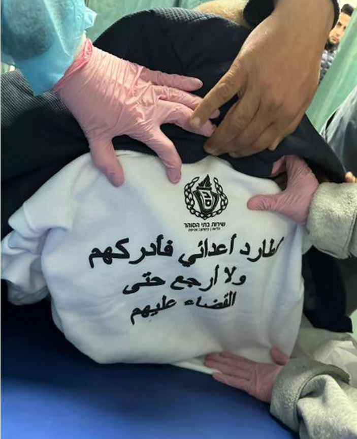 Serbest bırakılan Filistinli rehine tarafından giyilen sweatshirt üzerinde “Düşmanlarımı takip ederim. Onları yakalarım ve yok edene kadar geri vermem.” yazıyor.