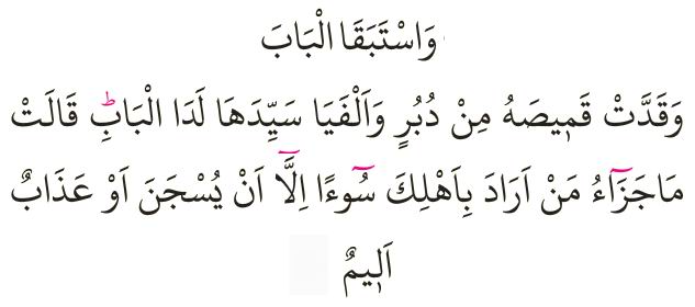 “Kapıya doğru ikisi de koştular. Kadın onun gömleğini arkadan çekip yırttı. (Tam) Kapının yanında kadının efendisiyle karşılaştılar. Kadın dedi ki: "Ailene kötülük isteyenin, zindana atılmaktan veya acıklı bir azabtan başka cezası ne olabilir?" (Yusuf – 25)