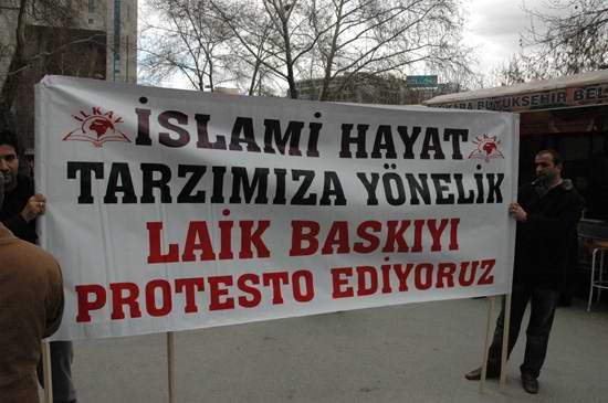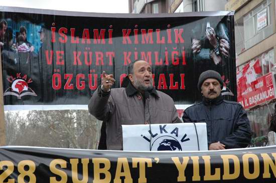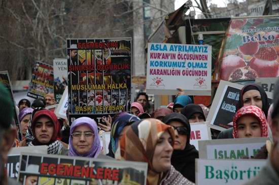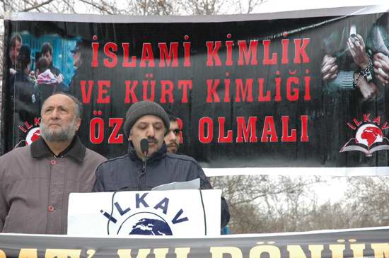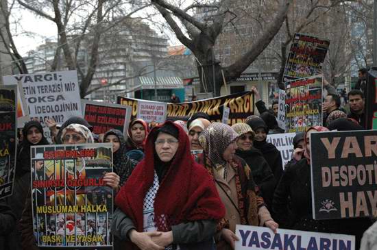 "İslami kimlik ve Kürt kimliği özgür olmalı", "Darbelere çetelere ergenekona hayır","28 Şubat zulmü kimi mağdurların eliyle sürdürülüyor","Yargı despotizmine hayır", "İslami hayat tarzımıza yönelik laik baskıyı protesto ediyoruz" pankart ve dövizlerinin taşındığı basın açıklamasında "Halkın düşmanı katil cunta", "Kahrolsun oligarşik çeteler", "Cuntaya hayır başörtüsüne özgürlük", "Uyan diren özgürleş", "Zulme karşı direneceğiz", "Adalet, özgürlük direnişle gelecek", "Darbeye çeteye katillere geçit yok" şeklinde sloganlar atıldı.