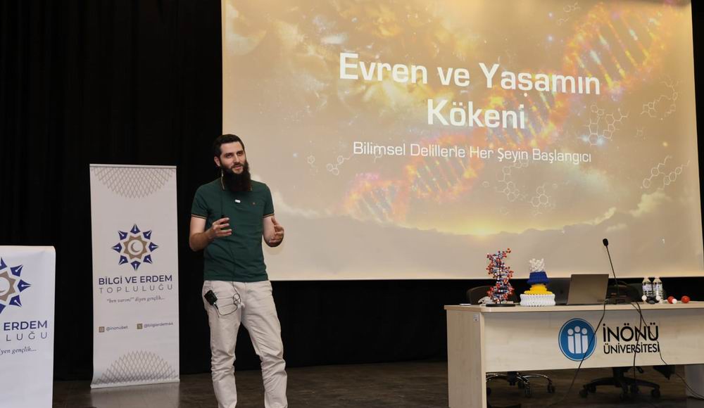 Malatya İnönü Üniversitesi Bilgi ve Erdem Topluluğu, modern bilimin en tartışmalı ve merak uyandıran başlıklarından biri olan “Evren ve Yaşamın Kökeni” konusunu, Boğaziçi Üniversitesi Moleküler Biyoloji ve Genetik Bölümü öğretim üyesi olan Dr. Öğretim Üyesi İbrahim Çağrı Kurt ile gerçekleştirilen konferansta masaya yatırdı. Yoğun bir katılımla gerçekleşen konferansta Dr. Kurt, evrimsel biyolojiden astrofiziğe kadar geniş bir yelpazede, tesadüf kavramını sorgulatan bilimsel kanıtları kapsamlı sunumuyla paylaştı.