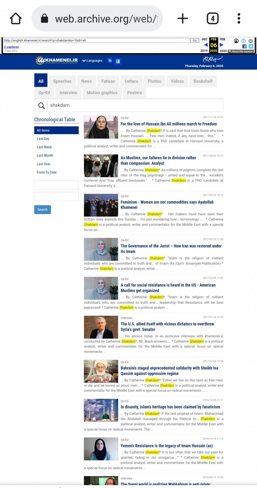 Gerçek kimliğini açıklayan Catherine Shakdam'ın, İran'ın dini lideri Ali Hamaney'in internet sitesindeki yazılarının arşiv kayıtları silindi. İran tarafından konu ile ilgili yapılan açıklamada da Shakdam ile devletin herhangi bir ilişkisinin bulunmadığı, yakın temasların reddedildiği yazıldı.