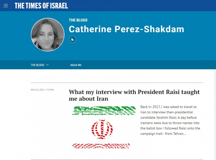 Catherine Perez-Shakdam'a ait makalelerin yayınlandığı Times of Israel adlı sitede kendisinden şöyle bahsediliyordu: