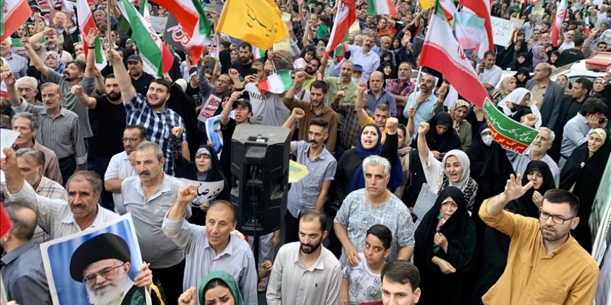 ABD’nin tehdit ettiği İran lideri Ayetullah Ali Hamaney’in posterlerini taşıyan İranlılar, sık sık “zillet bizden uzaktır”, “Amerika’ya ölüm”, “İsrail’e ölüm”, “taviz yok” sloganları attı.