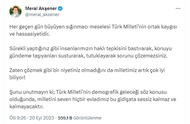 İYİ Parti Genel Başkanı Meral Akşener ırkçı çeteler ve haber sitelerine yönelik soruşturma ve gözaltı süreçlerini "insanlarımızın haklı tepkisini bastırmak" şeklinde niteledi!
