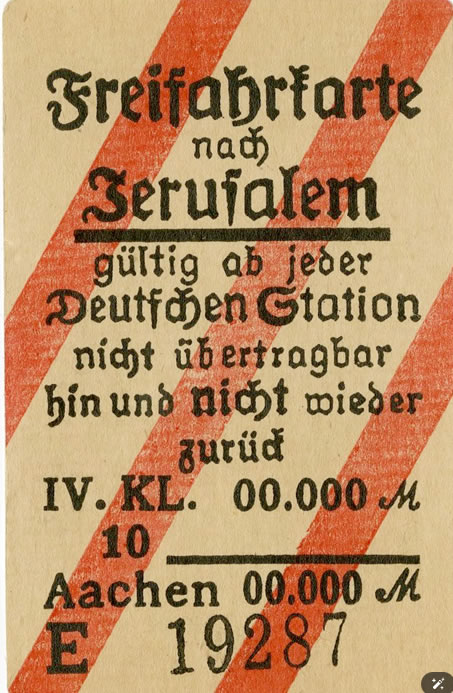 Üzerinde “Kudüs’e tek yön” yazılı bu antisemitik görsel,1930’larda Almanya’da Yahudilere yönelik olarak hazırlanmış. Altında da “Kudüs’e ücretsiz bilet, herhangi bir Alman tren istasyonunda geçerli, devredilmez, geri dönüşü olmayan tek yön, dördüncü sınıf” yazıyor. Bkz. https://dynasty-auctions.com/en/items/one-way-ticket-to-jerusalem-antisemitic-train-ticket-handed-out-at-train-stations-in-germany/ )