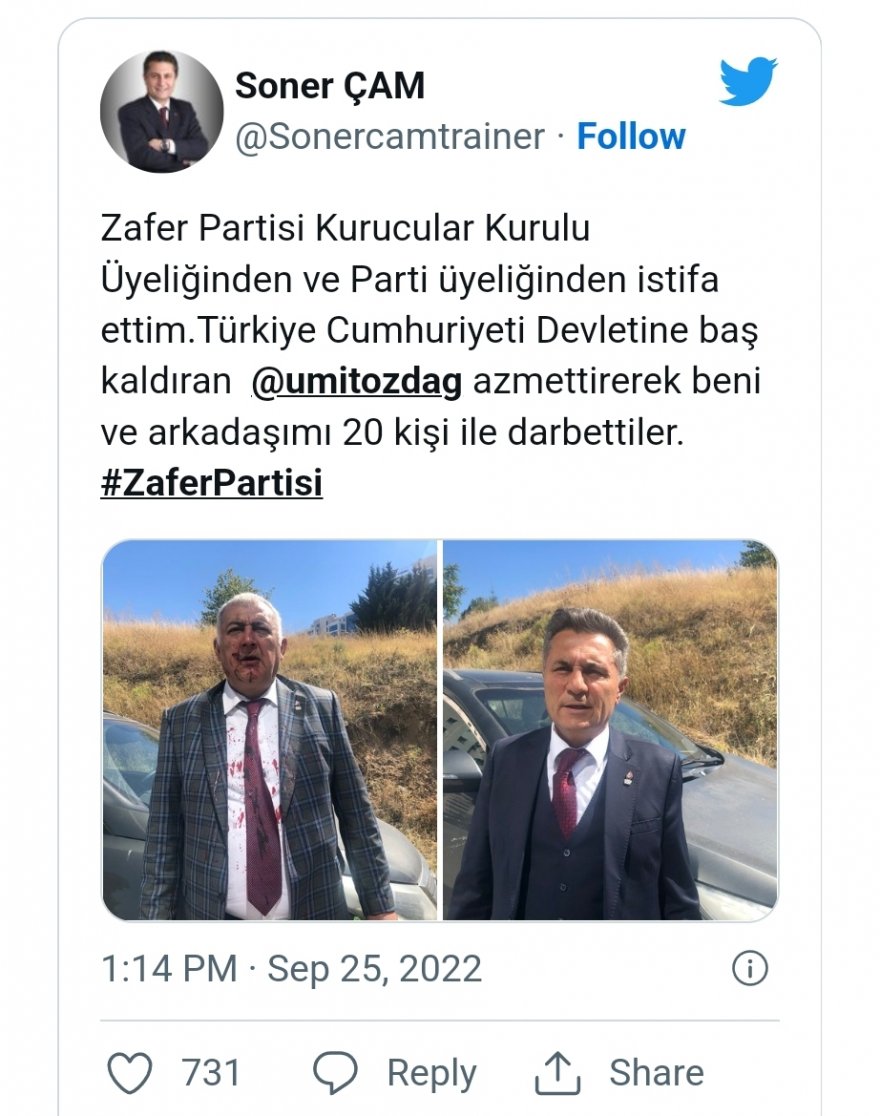 Zafer Partisi Kurucular Kurulu Üyesi Soner Çam, sosyal medya hesabından yaptığı paylaşımda ırkçı Zafer Partisi lideri Ümit Özdağ tarafından darbettirildiğini iddia ederek partisinden istifa ettiğini duyurdu.