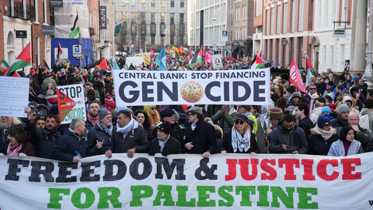 İrlanda Filistin Dayanışma Derneğinin organize ettiği yürüyüş, Dublin'deki Garden of Remembrance Parkı'ndan başlayarak İrlanda Parlamentosu önünde düzenlenen gösteriyle sona erdi.