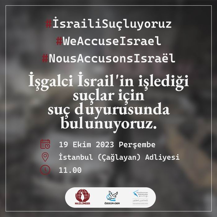 Mazlumder, Özgür-Der ve Uluslarası Hukukçular Birliği 19 Ekim Perşembe (Yarın) günü saat 11'de İstanbul’daki Çağlayan adliyesi önünde buluşup, işgalci İsrail’in katliamlarında rol alan Siyonist idareciler hakkında insanlığa karşı suçlar ve savaş suçları nedeniyle yargılanması için suç duyurusunda bulunup, yargılanması istenecek.