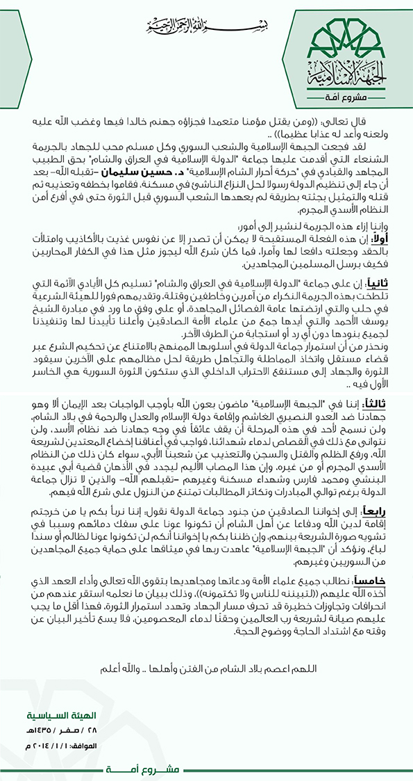 3-Biz, İslam Cephesinde Allah’ın yardımıyla savaşmaya devam ediyoruz. İmandan sonra gelen en önemli vaciplerden olan düşman ve alevi mücrimlere karşı cihad etmek Şam bölgesinde İslam devleti kurmak ve rahmet ve adaleti kurmak için cihad ediyoruz. Biz Esed rejimine karşı cihad ederken bize engel olan hiç kimseye müsamaha etmeyiz ve şehitlerin kanlarını yerde bırakmayacağız. Bizim görevimiz katillerin Allah’ın Şeriatına uymalarını sağlamak ve aziz halkımıza yapılan zulüm, öldürme, kaçırma, hapis ve işkencenin kaldırılmasını sağlamak her ne taraftan olursa olsun Esed tarafından da olsa. Bu büyük zulüm akıllarda Ebu Ubeyde El-benniş ve Muhammed Faris ve Meskene şehitleri ve başkaları akıllarda bu acıları yeniden canlandıracaktır. (Allah Kabul Etsin.) Devle tarafıyla bütün görüşmeler ve taleplere rağmen Devle Allah’ın Şeriatı ve kanunlarına uymayı kabul etmemektedir.