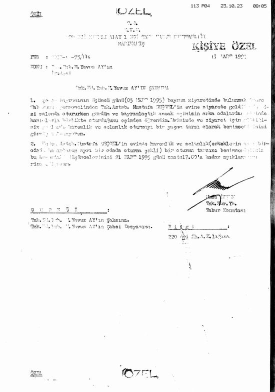 BELGE 1: Balyoz Darbe Planı davasının sanığı emekli Albay Musa İstek, görev yaptığı dönemde; askerlerle bayramlaşmaya gitmiş ve M.Yavuz Ay'ın eşinin kadınlarla birlikte oturduğunu eşi vasıtasıyla öğrenmiş, ardından M.Yavuz Ay'dan savunma bile istemiş. İşte Kurmay Yarbay Musa İstek'in, bayram ziyaretinde başörtülü avına çıktıklarını gösteren resmi belge!