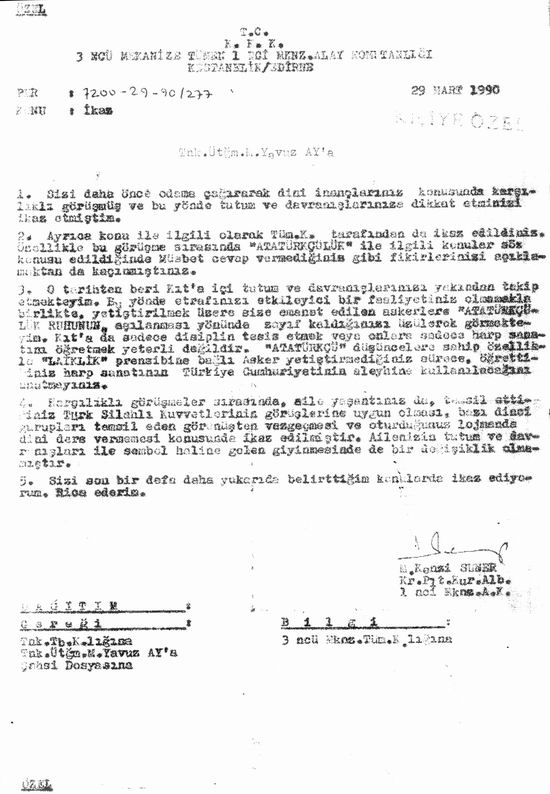 3. O tarihten beri Kıt'a içi tutum ve davranışlarınızı yakından takip etmekteyim. Bu yönde etrafınızı etkileyici bir faaliyetiniz olmamakla birlikte, yetiştirilmek üzere size emanet edilen askerlere "ATATÜRKÇÜLÜK RUHUNUN" aşılanması yönünde zayıf kaldığınızı üzülerek görmekteyim. Kıt'ada sadece disiplin tesis etmek veya onlara sadece harp sanatını öğretmek yeterli değildir. "ATATÜRKÇÜ" düşüncelere sahip özellikle LAİKLİK" prensibine bağlı asker yetiştirmediğiniz sürece, öğrettiğiniz harp sanatının Türkiye Cumhuriyetinin aleyhine kullanılacağını unutmayınız.
