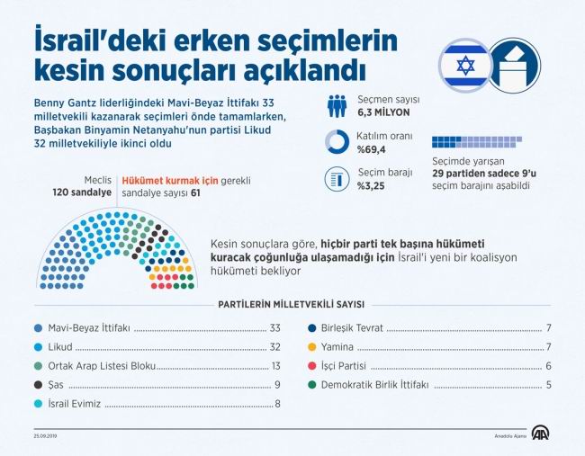 İsrail Merkez Seçim Komisyonun, 17 Eylül'de yapılan erken genel seçimlere ilişkin açıkladığı kesin sonuçlara göre, seçimleri, 33 milletvekili çıkaran Başbakan Binyamin Netanyahu'nun rakibi Benny Gantz liderliğindeki Mavi-Beyaz İttifakı önde tamamladı.