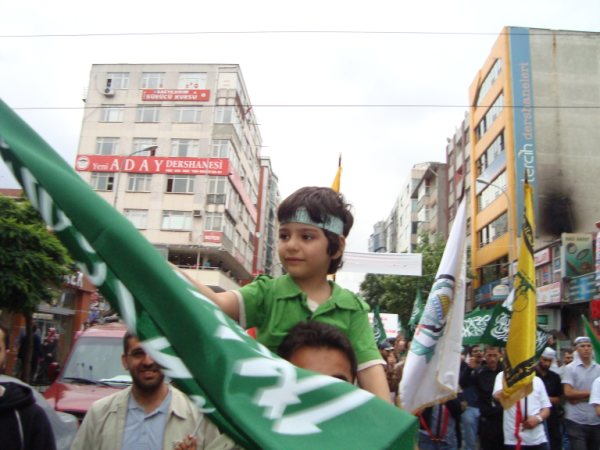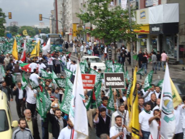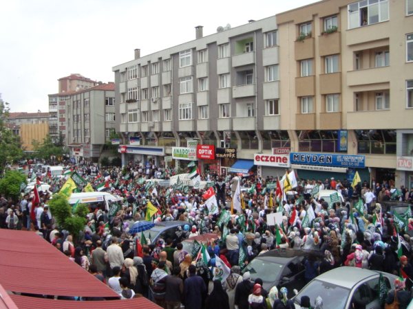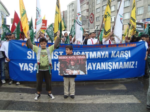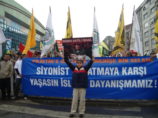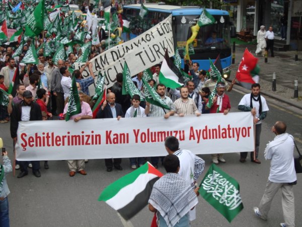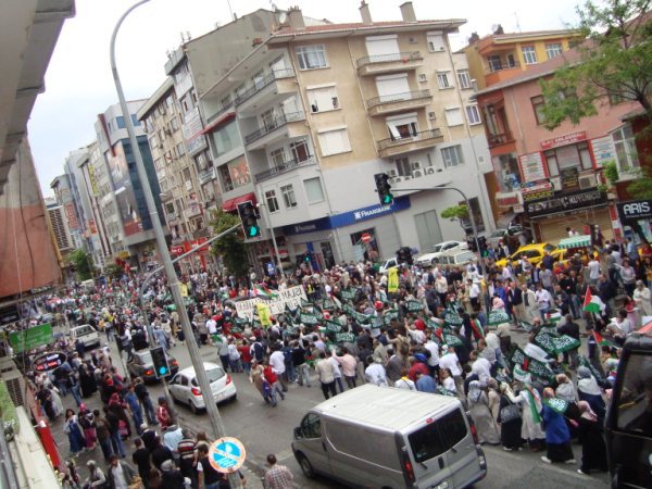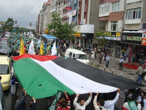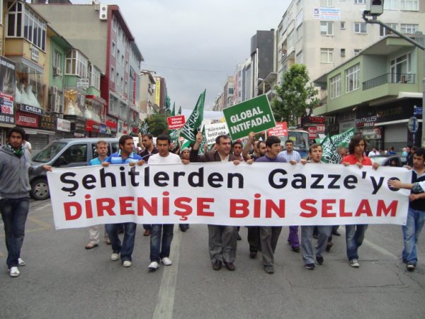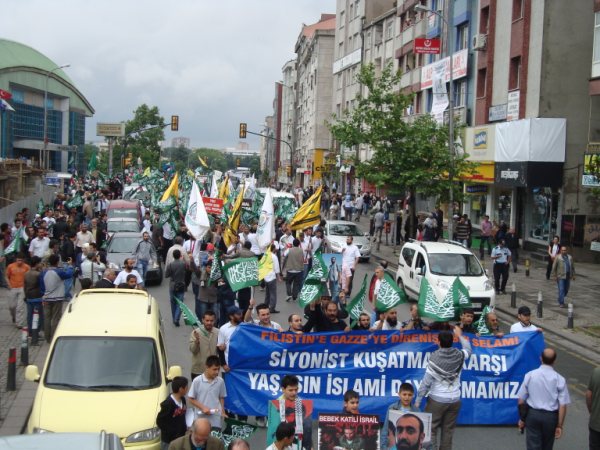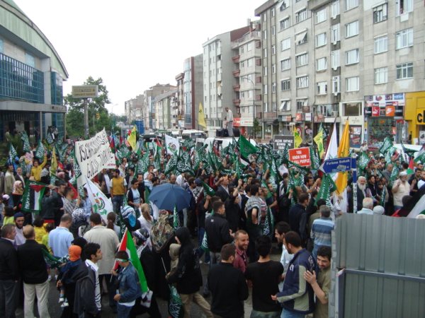 8 Haziran Pazar günü saat 15'de Haldun Alagaş Spor Kompleksi önünden başlayan yürüyüş yaklaşık 3 kilometre ötede bulunan Ümraniye Belediyesi binasına değin genişleyerek sürdü. Çevre esnafının ve yolda geçen vatandaşların da ıslık ve alkışlarıyla destek verdiği gösteride "Filistin'e, Gazze'ye, Direnişe Bin Selam: SİYONİST KUŞATMAYA KARŞI YAŞASIN İSLAMİ DAYANIŞMAMIZ!"; "Şehitlerimizin Kanı Yolumuzu Aydınlatıyor!"; "Şehitlerimiz Yolumuzun Adınlığıdır!" ve "Siyonist Elçilik Kapatılsın!" pankartları açılırken göstericiler "Dostluğumuz ne kadar değerliyse düşmanlığımız o kadar şiddetlidir!"; "Bebek katili İsrail!"; "Küresel İntifada başlamıştır!"; "Global İntifada!"; "Hamas'a Selam Direnişe Devam!" vb. dövizler taşıdılar. Şehitleri anmak amacıyla sık sık teşrik tekbirlerinin getirildiği yürüyüş boyunca katılımcılar "Kahrolsun İsrail, Kahrolsun Amerika!"; "Siyonist Katiller Hesap Verecek!"; "Yaşasın Küresel İntifada!"; "Karada, Denizde, İntifada Her Yerde!"; "Her Yer Filistin, Hepimiz Filistinliyiz!"; "Siyonist Elçilik Kapatılsın!"; "Zulme Karşı Omuz Omuza!"; "Şehitlerin Yolunu Sürdüreceğiz!" vb. sloganlar attılar.