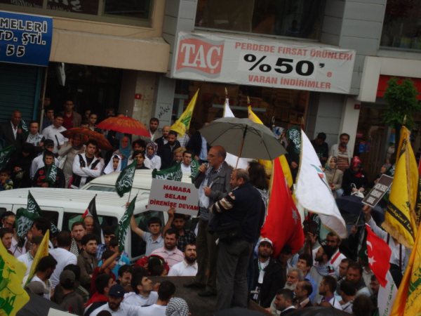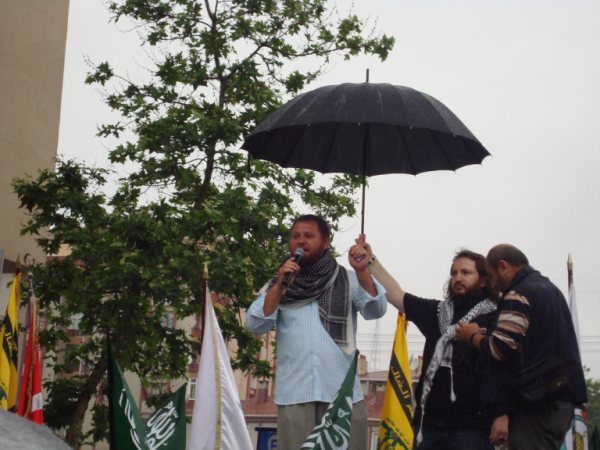 Yaklaşık bir saat süren yürüyüşe müteakip Ümraniye Belediyesi binası önünde toplanan topluluk sağanak yağmura rağmen buradaki bekleyişini de sürdürdü. Topluluğa yönelik ilk olarak söz alan Vuslat Dergisi yazarlarından Ahmet Kalkan, Gazze Yardım Filosu ve yolcularına yönelik sergilenen Siyonist vahşetin ilk olmadığına dikkat çekerek İsrail'in İslam dünyasının bağrına yerleştirilmiş ileri bir karakol olduğunu ve varlığını başta emperyalistlerin desteği olmak üzere Müslüman halkların yöneticilerinin işbirlikçiliklerine borçlu olduğunu söyledi.