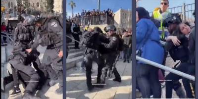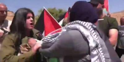 İşgalci İsrail askerini yaşlı bir adamı sert bir şekilde iteklediği için uyaran Filistinli kadın, İsrailli kadın askerin üzerine yürümesiyle beraber askeri sert bir şekilde iterek püskürttü!