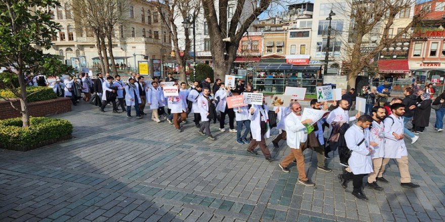 İstanbul il sağlık Müdürlüğü önünde toplanan doktorlar, ellerinde işgal rejimi aleyhine, Gazze lehine taşıdıkları dövizlerle sessiz bir şekilde Sultanahmet Meydanı'na kadar yürüdü.