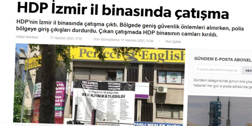 HDP’nin İzmir il binası silahlı bir saldırgan tarafından basılarak ateşe verildi. Yeni Şafak gazetesinin ise olayı “çatışma” diye sunması dikkat çekici.
