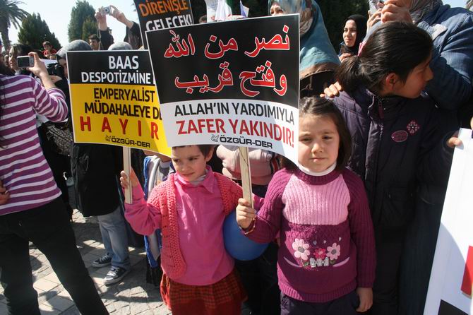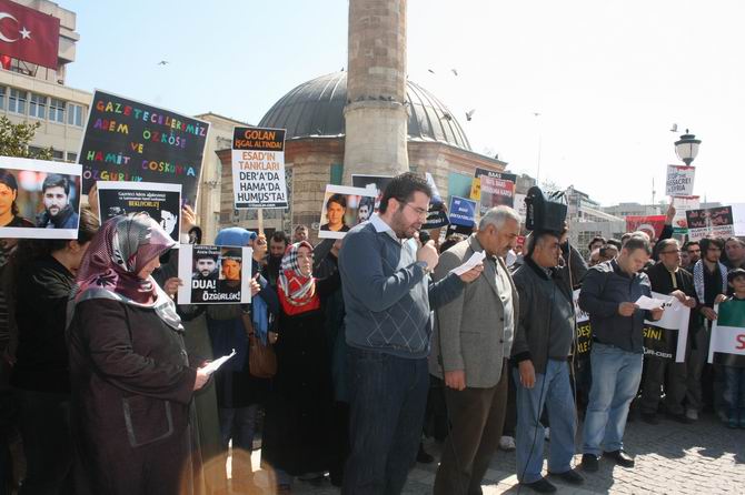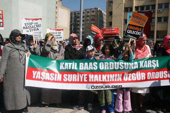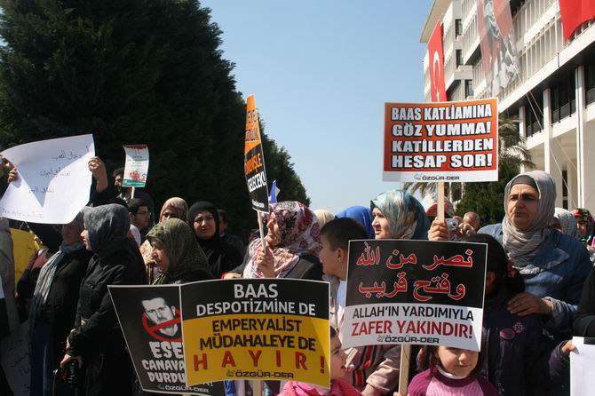 Özgün-Der, İZYAD, Mazlum-Der İzmir Şubesi, Çağrı-Der tarafından da desteklenen eylemde “Suriye'de Vahşet Sürüyor: Sessiz Kalmak Suç Ortaklığıdır! Katliamı Durdurun”, “Katil Baas Ordusu'na Karşı Yaşasın Suriye Halkının Özgür Ordusu”, “Birinci Yıldönümünde Suriye İntifadası'na Bin Selam”, Zulüm, Katliam, İşkence Karşısında Susmak; Baas Despotizminin Suçuna Ortak Olmaktır”, “Katil Baas Çetesinin Karşısında, Kardeş Suriye Halkının Yanındayız” pankartları açıldı.