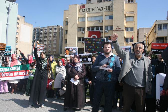 Hamza Akdeniz'in yönettiği eylemde, “Suriye'ye Özgürlük Direnişle Gelecek”, “Katliam, Zulüm, Fesad; Kahrolsun Esad!”, “Diktatörler Yıkılacak, İslamî Direniş Kazanacak”, Katil Esed Hesap Verecek”, “İslâm Ümmeti, Kabul Etmez Zilleti”, “Suriyeli Şehidler Onurumuzdur”, “İzmir'den Hama'ya, Direnişe Bin Selam”, “”Katil Esed, Sonun Mübarek Olsun”, “Yaşasın Suriye Özgür Ordusu”, “Susma Haykır, Direniş Haktır”, “Yallah İrhal Ya Beşşar”, “Eşşa'b Yurid İskatün Nizam”, “Lebbeyk, Lebbeyk, Lebbeyk Ya Allah!” sloganları atıldı, tekbirler getirildi.