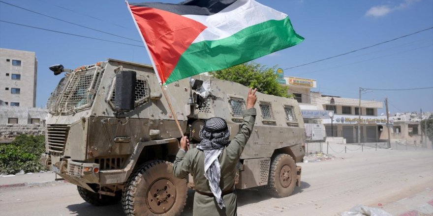 Saldırı sırasında bir Filistinlinin işgalcileri Filistin bayrağı sallayarak karşılaması dikkat çekti.