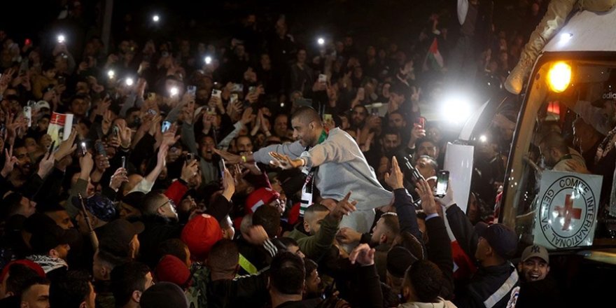 Katil İsrail'in, Hamas'la yapılan Gazze'deki ateşkes ve takas anlaşması kapsamında serbest bırakılan Filistinli esirlerin sevincini baskınlar, saldırı ve tehdit yoluyla çalmaya çalıştığı bildirildi.
