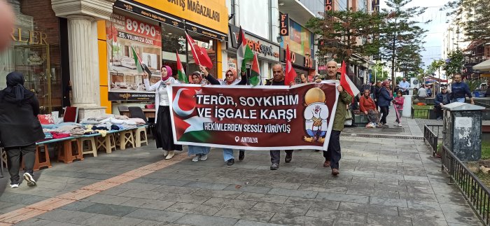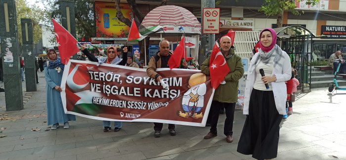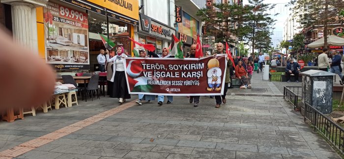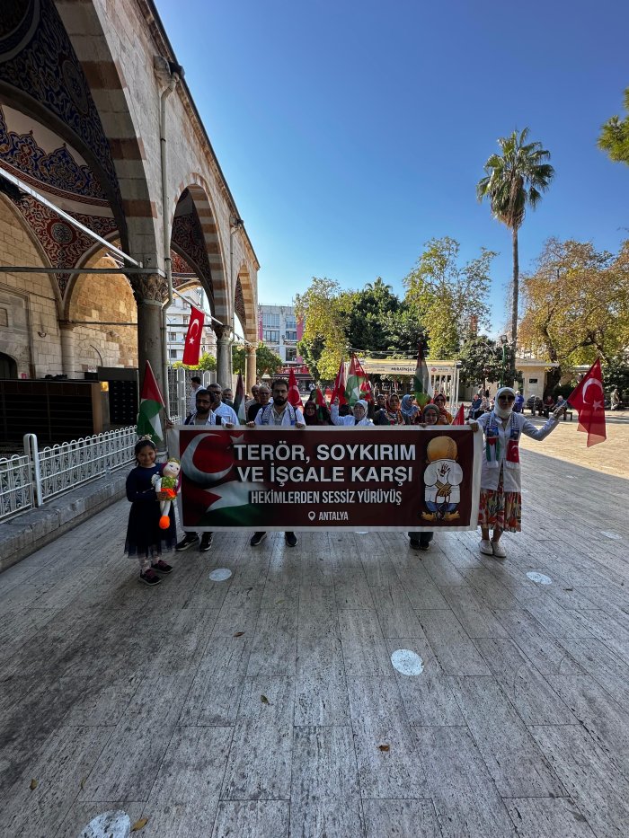 Antalya’da Muratpaşa Camii’nde bir araya gelen sağlık çalışanları Siyonist İsrail’in Gazze’deki katliamlarını protesto etmek için Kapalıyol havuz başına kadar yürüyüş gerçekleştirdiler.