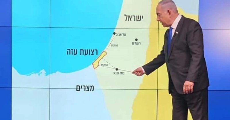 Netanyahu, dün basın mensuplarına gösterdiği haritada, Batı Şeria'nın bulunduğu bölgeyi tamamen İsrail toprağı şeklinde gösterirken, Mısır ile Gazze sınır hattındaki Philadelphi Koridoru'nda işgalin devam edeceğini söyledi.
