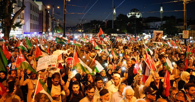 Yedi Hilal Topluluğu öncülüğünde düzenlenen etkinlikte katılımcılar, “Hep Birlikte Ayağa Kalkıyoruz! İsrail’i ve ABD’yi Yüksek Sesle Lanetliyoruz!” sloganlarıyla tepkilerini dile getirdi.