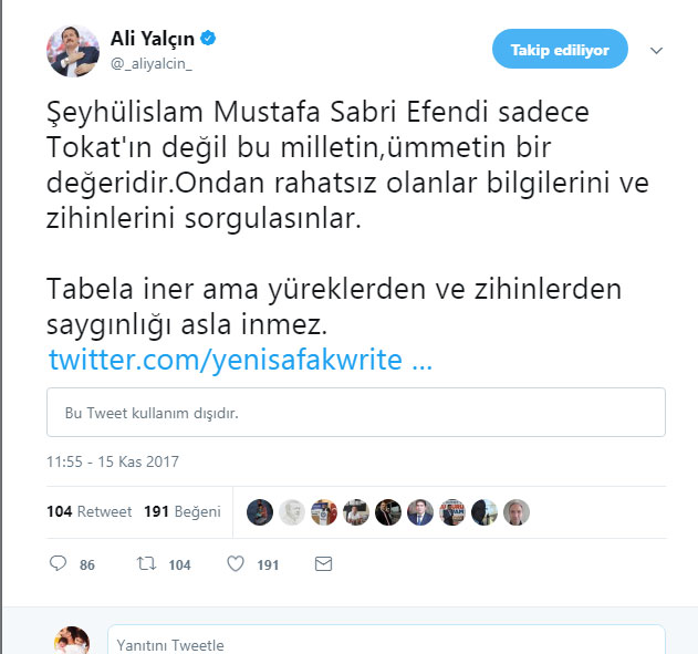 İki gün önce, bir “Mustafa Sabri Efendi tartışması” çıktı: Tokat’taki bir imam-hatip lisesine Tokatlı Şeyhülislâm Mustafa Sabri Efendi’nin ismi verilmiş ama gelen tepkiler üzerine vazgeçilmiş ve okulun ismi “Tokat Şehit Yakup Akdağ Anadolu İmam Hatip Lisesi” yapılmış.