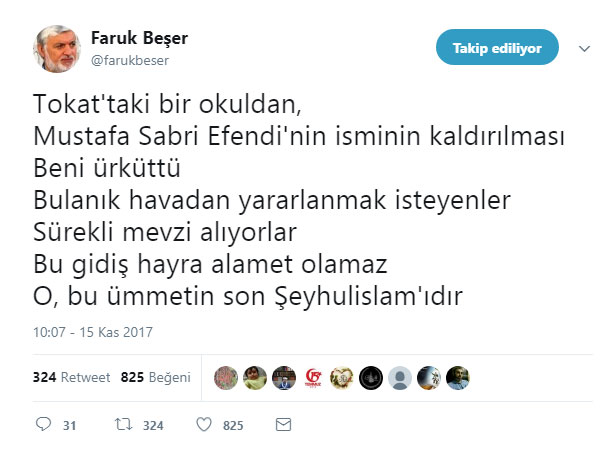 İktidarın Atatürk/Atatürkçülük açılımı sonrasında Kemalistlerin tazyikiyle Tokat’taki bir okulda Osmanlı’nın son Şeyhulislam’ı Mustafa Sabri Efendi adının MEB tarafından değiştirilmesine tepki geldi.