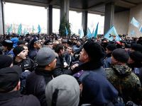 Başkent Akmescit'te parlamento binası önünde toplanan Rusya yanlıları ile Kırım Tatarları arasında çıkan arbedede 26 kişi yaralandı.