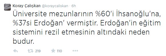 "Üniversite mezunlarının %60'i İhsanoğlu'na, %37si Erdoğan' vermiştir. Erdoğan'in eğitim sistemini rezil etmesinin altındaki neden budur" diyen Çalışkan, üstü kapalı olarak eğitimli kesmin Erdoğan'a oy vermediğini söylemeye çalıştı.