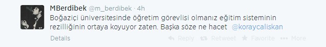 Çalışkan'ın bu tweetine cevaben takipçilerinden biri "Boğaziçi Üniversitesi'nde öğretim görevlisi olmanız eğitim sisteminin rezilliğini ortaya koyuyor zaten" dedi.