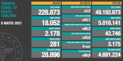 Türkiye'de son 24 saatte 228 bin 873 Kovid-19 testi yapıldı, 18 bin 52 kişinin testi pozitif çıktı, 281 kişi hayatını kaybetti.