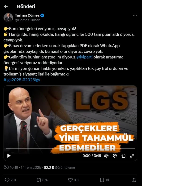 Milli Eğitim Bakanı Yusuf Tekin en açık bir dille iddianın tutarsızlığını ortaya koymasına rağmen Turhan Çömez hiçbir şey olmamış gibi sınav hakkında başka birtakım saçmalıklarla iddiasını dolaylı biçimde sürdürüyor.