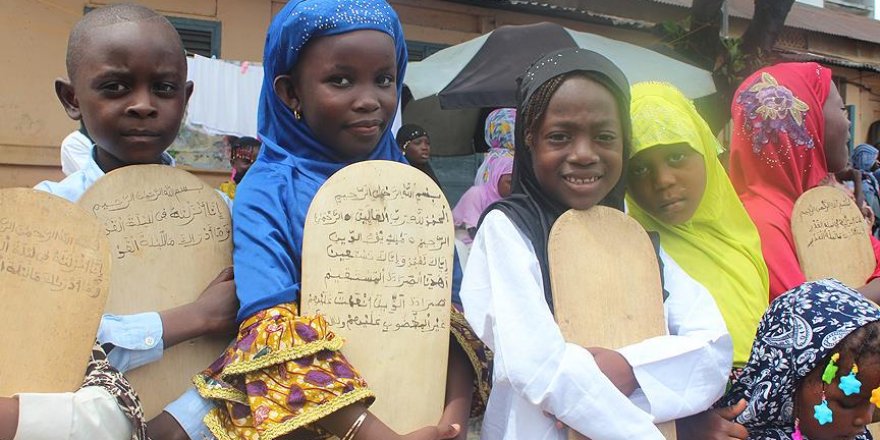 Afrika ülkesi Gine'nin başkenti Konakri'deki kurslarda çocuklar, tahta levha üzerine yazılan ayetleri ezberliyor.