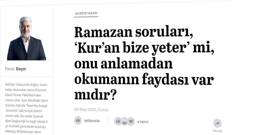 Faruk Beşer’in Yeni Şafak gazetesinde yayımlanan konuyla alakalı yazısı (08 Mayıs 2020) şöyle: