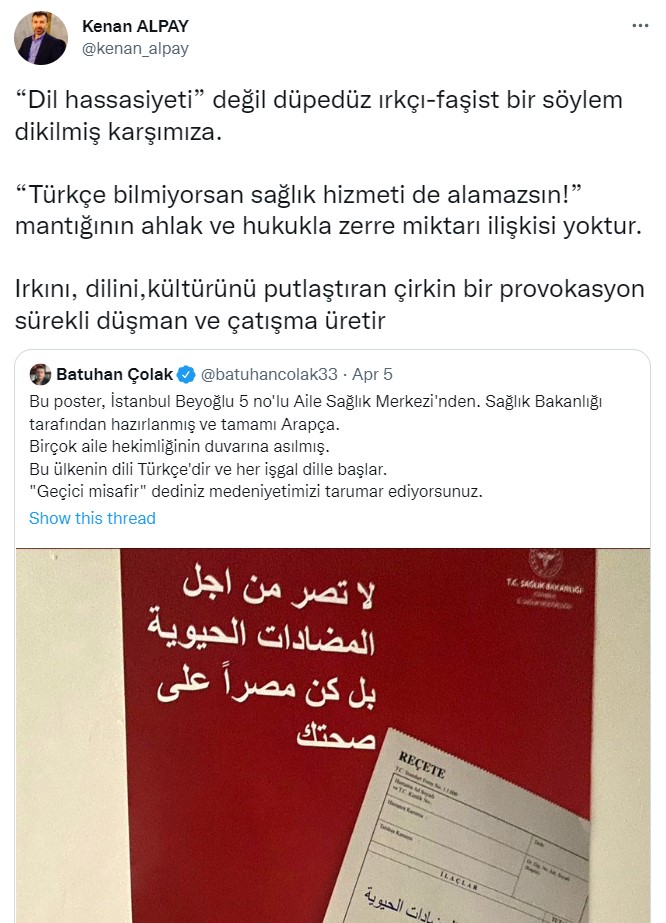 Türkçe haricinde özellikle ‘Arapçanın kamu kurumlarından olan Sağlık Ocaklarında kullanılması kimi kesimlerde rahatsızlık uyandırdı. Üstelik bilgilendirici, yönlendirici ve kolaylaştırıcı mahiyetteki afişler dolayısıyla Türkiye’nin “işgal” edilmeye başlandığı gibi paranoid-şizofrenik feveranlarla sosyal medya üzerinden yine “Araplar ülkemizi istila ediyorlar!” türü kampanyalar örgütleniyor.