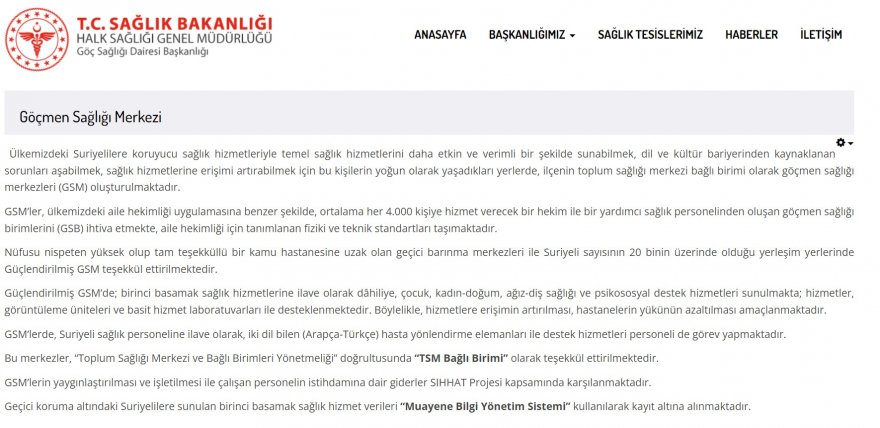 Sağlık Bakanlığı’na bağlı Göçmen Sağlığı Merkezi adı verilen Sağlık Ocaklarında, “GSM’ler, ülkemizdeki aile hekimliği uygulamasına benzer şekilde, ortalama her 4.000 kişiye hizmet verecek bir hekim ile bir yardımcı sağlık personelinden oluşan göçmen sağlığı birimlerini (GSB) ihtiva etmekte, aile hekimliği için tanımlanan fiziki ve teknik standartları taşımaktadır. Güçlendirilmiş GSM’de; birinci basamak sağlık hizmetlerine ilave olarak dâhiliye, çocuk, kadın-doğum, ağız-diş sağlığı ve psikososyal destek hizmetleri sunulmakta; hizmetler, görüntüleme üniteleri ve basit hizmet laboratuvarları ile desteklenmektedir. Böylelikle, hizmetlere erişimin artırılması, hastanelerin yükünün azaltılması amaçlanmaktadır.” hizmeti sunulduğu ve dil konusunda da, “GSM’lerde, Suriyeli sağlık personeline ilave olarak, iki dil bilen (Arapça-Türkçe) hasta yönlendirme elemanları ile destek hizmetleri personeli de görev yapmaktadır.” deniliyor.